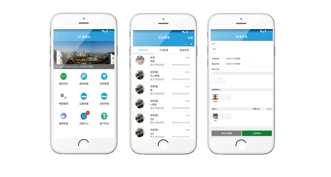 出差、請假、加班、外勤打卡以及任務管理,都能在辦公平臺實現,并能實時跟蹤任務完成進度,對執行人進行評價,形成閉環.